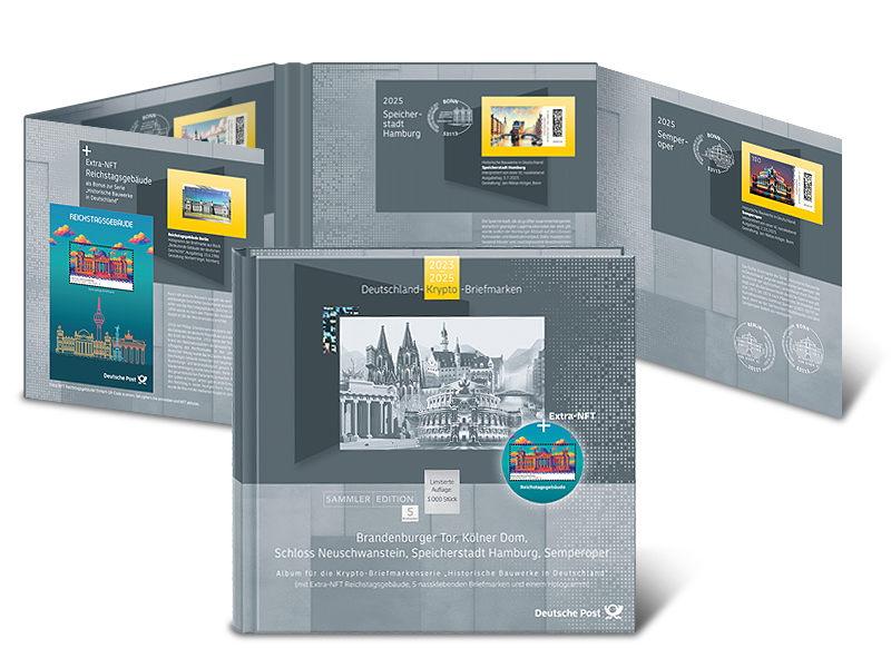 Hochwertiges folienveredeltes Hardcover-Album mit unbestückten Einstecktaschen zur Aufnahme aller 5 bisher erschienen 5 Kryptomarken-Ausgaben. Exklusives Sammlerstück mit einem zusätzlichem NFT "Reichstagsgebäude", einem Hologramm der Briefmarke "Reichstagsgebäude Berlin" von 1986 sowie allen 5 Sondermarken der Serie "Historische Bauwerke in Deutschland" (Bund 2023 - 2025, postfrisch in Klemmtaschen).