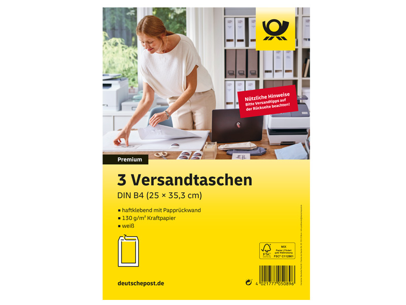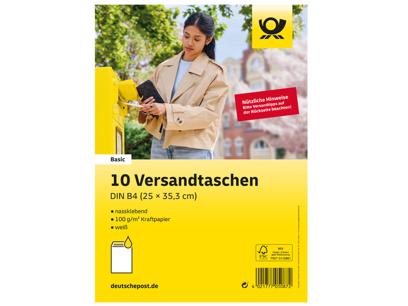Besonders beliebt sind Versandtaschen im Format DIN C4 und DIN C5, da sie sich ideal eignen, um kleine Kataloge, Broschüren, Bedienungsanleitungen oder andere mehrseitige Dokumente zu versenden. Versandtaschen der DIN B-Reihe sind zum Versand von ca. 5 — 8 Blättern geeignet. Versandtaschen werden mit oder ohne Fenster angeboten. Wenn Sie Versandtaschen mit Fenster verwenden, sparen Sie sich das Adressieren der Umschläge. Entscheiden Sie sich für eine Versandtasche ohne Fenster, können Sie diese entweder von Hand, mit dem Drucker oder auch mit selbstklebenden Etiketten beschriften.