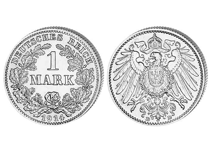 Die Mark zeigt u. a. den Reichsadler mit einem nach dem Wunsch Kaiser Wilhelms II. verkleinerten Hohenzollern-Wappen.