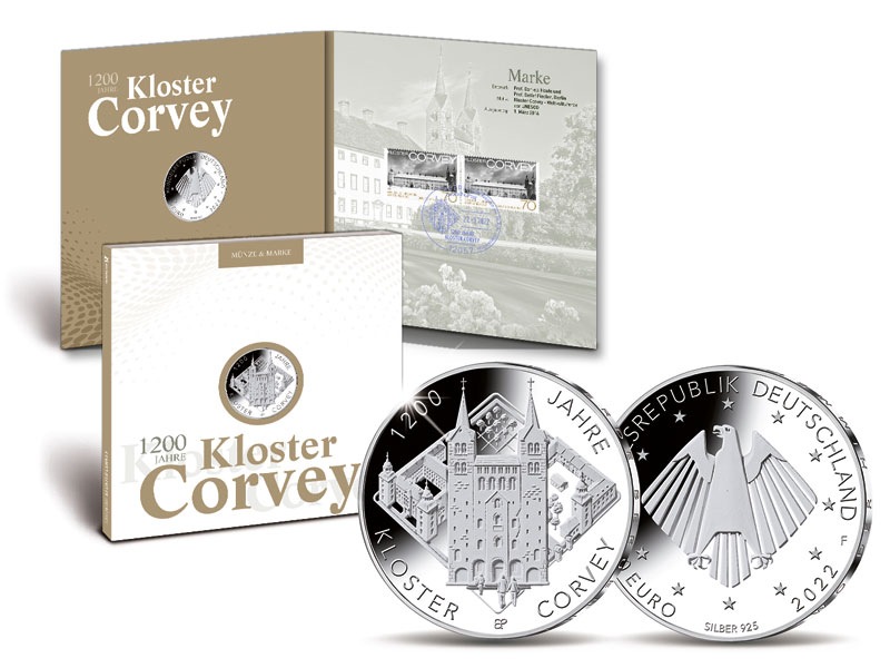 Das UNESCO-Weltkulturerbe Corvey als Numisfolder! Die 20-Euro-Silbermünze in Spiegelglanz-Qualität und ein Pärchen der Sondermarke "Kloster Corvey - Weltkulturerbe der UNESCO" (Bund, 2016) mit Stempel "Berlin" zum Münz-Ausgabetag 22.09.2022 als schönes Set.