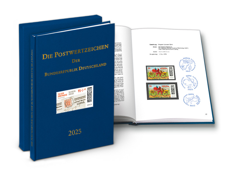 Alle 63 nass- und selbstklebenden Briefmarken, 2 Blockausgaben sowie 1 Philatelie-Block (postfrisch in Klemmtaschen). Mit Infos zu den Ausgabeanlässen und Abdrucken der Ersttagsstempel "Bonn"/"Berlin" bzw. der Erstverwendungsstempel "Bonn". Sondermarke "Chemnitz" aus der Serie "Zeitreise Deutschland" (03.04.2025) als Hologramm und als Schwarzdruck. Sondermarke "Schätze der Philatelie - Sachsen-Dreier" der Serie "Tag der Briefmarke" (04.09.2025) als geprägte Titelmarke. Inkl. Schmuckschuber, einzeln nummeriert.