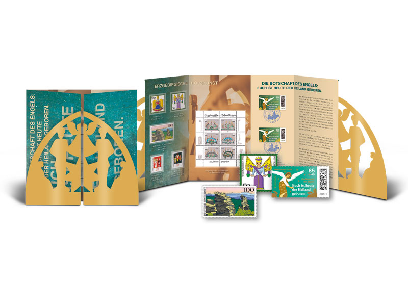 Mit 2 aktuellen Sondermarken "Die Botschaft des Engels: ‚Euch ist heute der Heiland geboren.’" (beide Ersttagsstempel vom 02.11.2023), 1 Kleinbogen und 5 weiteren Original-Weihnachtsmarken mit Erzgebirgsmotiven (Bund, DDR, 1967-1994, postfrisch in Klemmtaschen).
