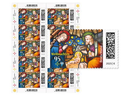 Sie erhalten die Weihnachtsmarken im nassklebenden Zehnerbogen oder im praktischen selbstklebenden Markenset mit je 10 Briefmarken für Standardbriefe zu 95 ct.